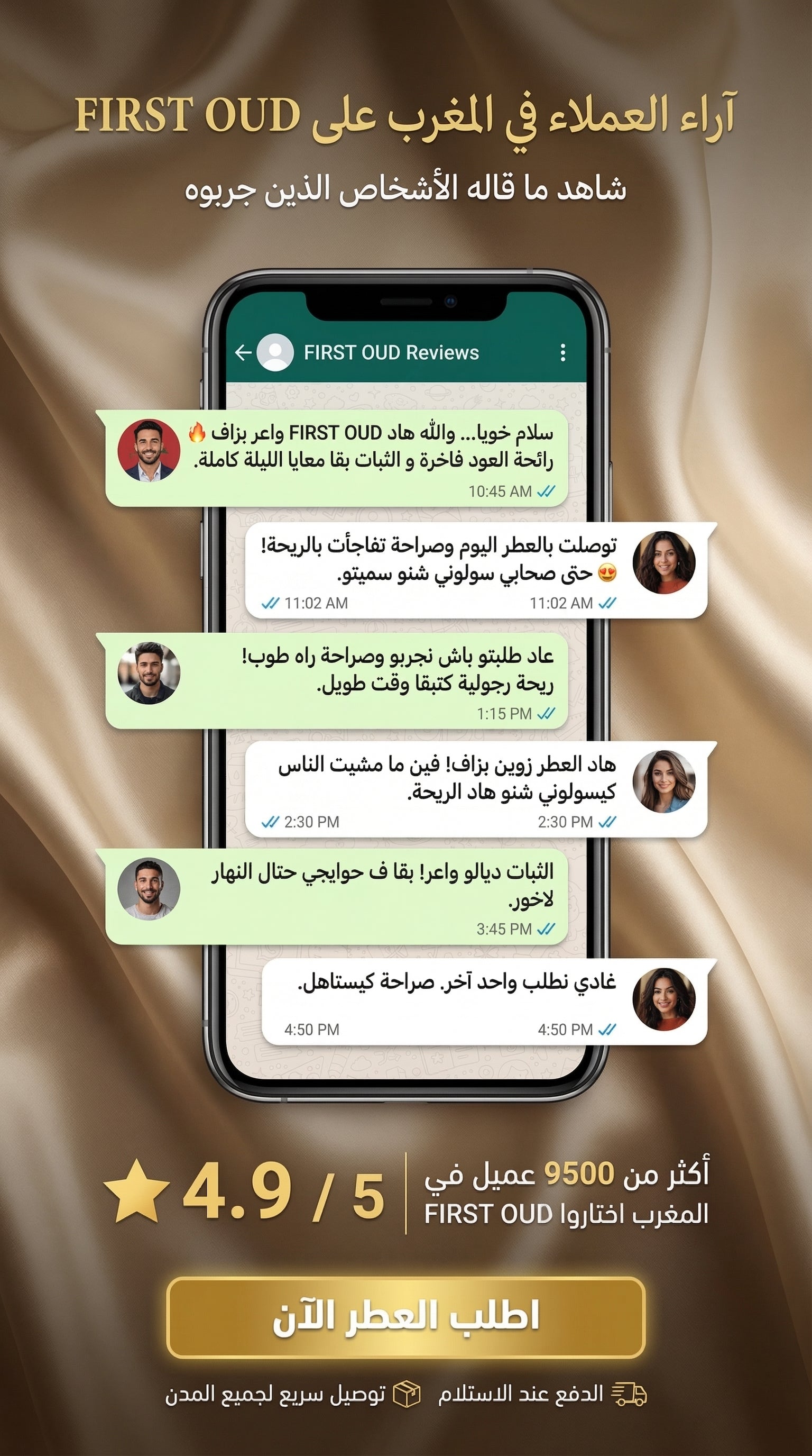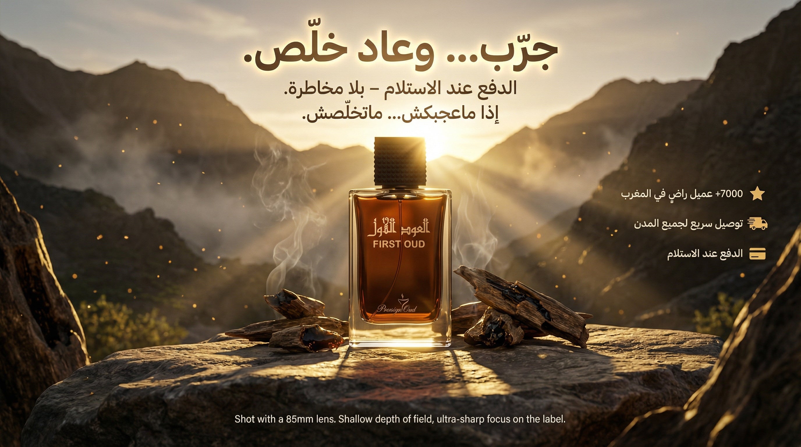 خدمة التوصيل كتوصل لعندك، كتفتح العطر وتشوف الجودة والريحة القوية، وإذا عجبك خلّص. تجربة بلا أي مخاطرة.